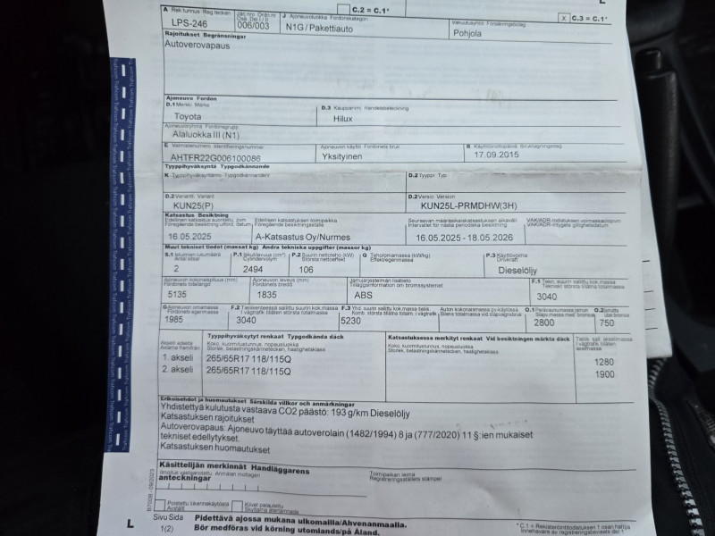 Koekäynnistetty. Ajosuorite 185175km. Rekisteritunnus LPS-246.