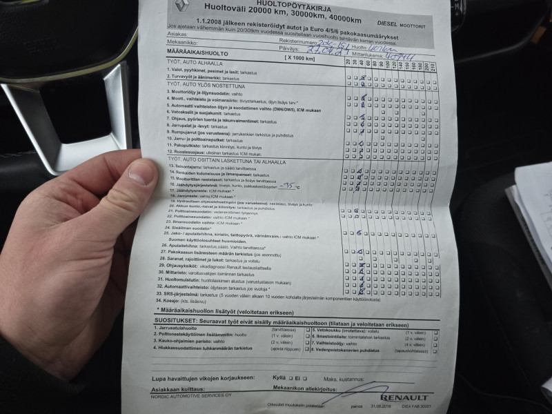 Huoltotosite vain n. 40tkm kohdalta. Etupuskuri irvistää. Oikean etuvalon yläpuolella konepellissä hankaumaa/jälki. Sivuoven kahvasta puuttuu pieni pala. Auton konetilassa rämisee / kolisee tyhjäkäynnillä, mutta häviää kaasuttaessa. Tuulilasi halki.