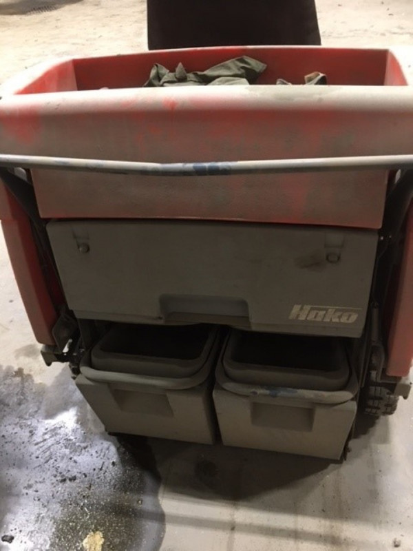 Akkukäyttöinen lakaisukone, merkki Hako. Kone toimii, mutta akut saattavat olla jo käyttöikänsä loppupuolella. Kauppaan kuuluu latausjohto ja laturi.