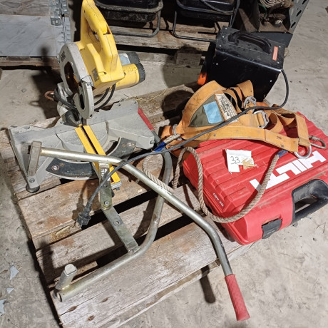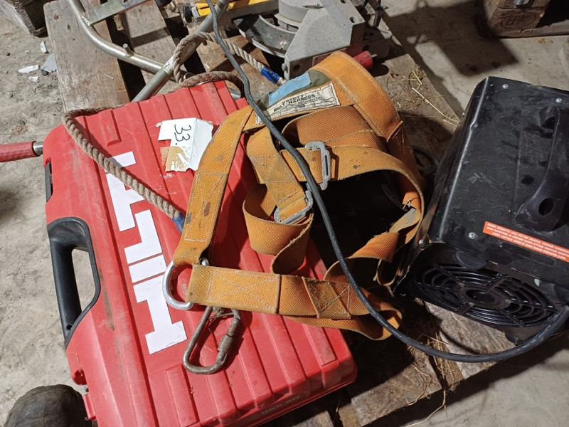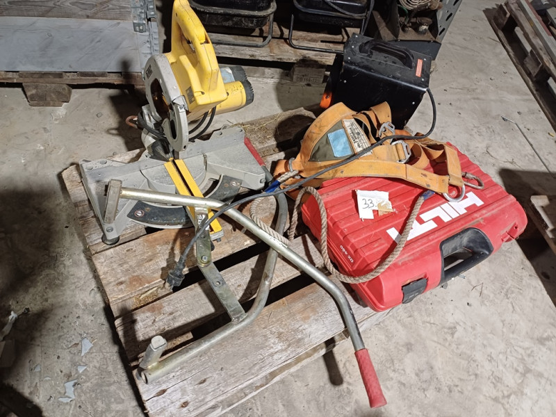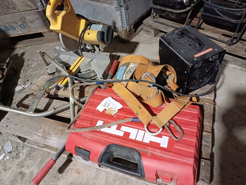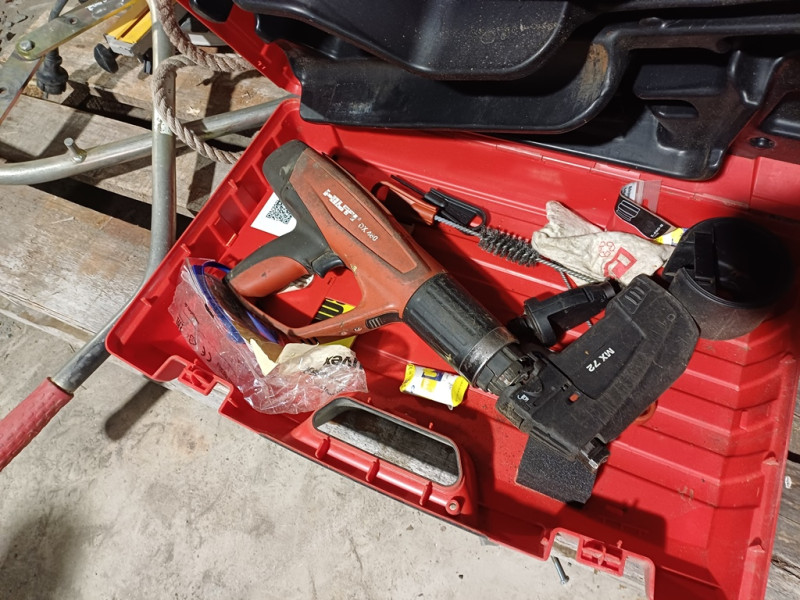 Hilti DX460 panosnaulain lippaalla.. kunnosta ei tietoa. Turvavaljaat. Harkkopihdit. Sähkölämmitin.